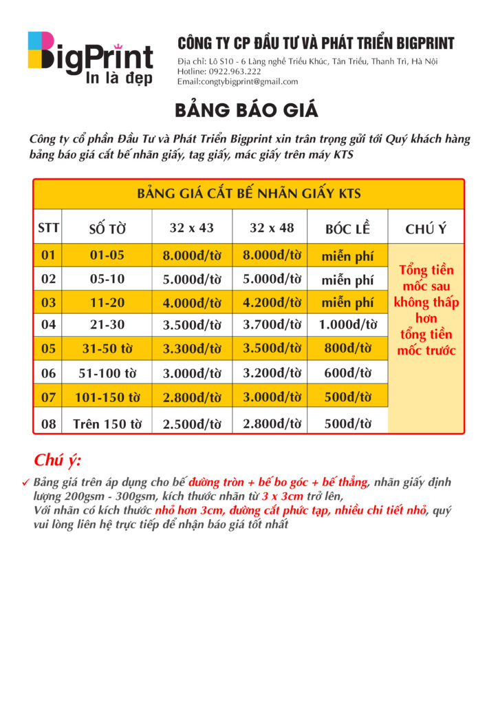 Bảng giá cắt bế nhãn giấy, tag giấy, mác giấy